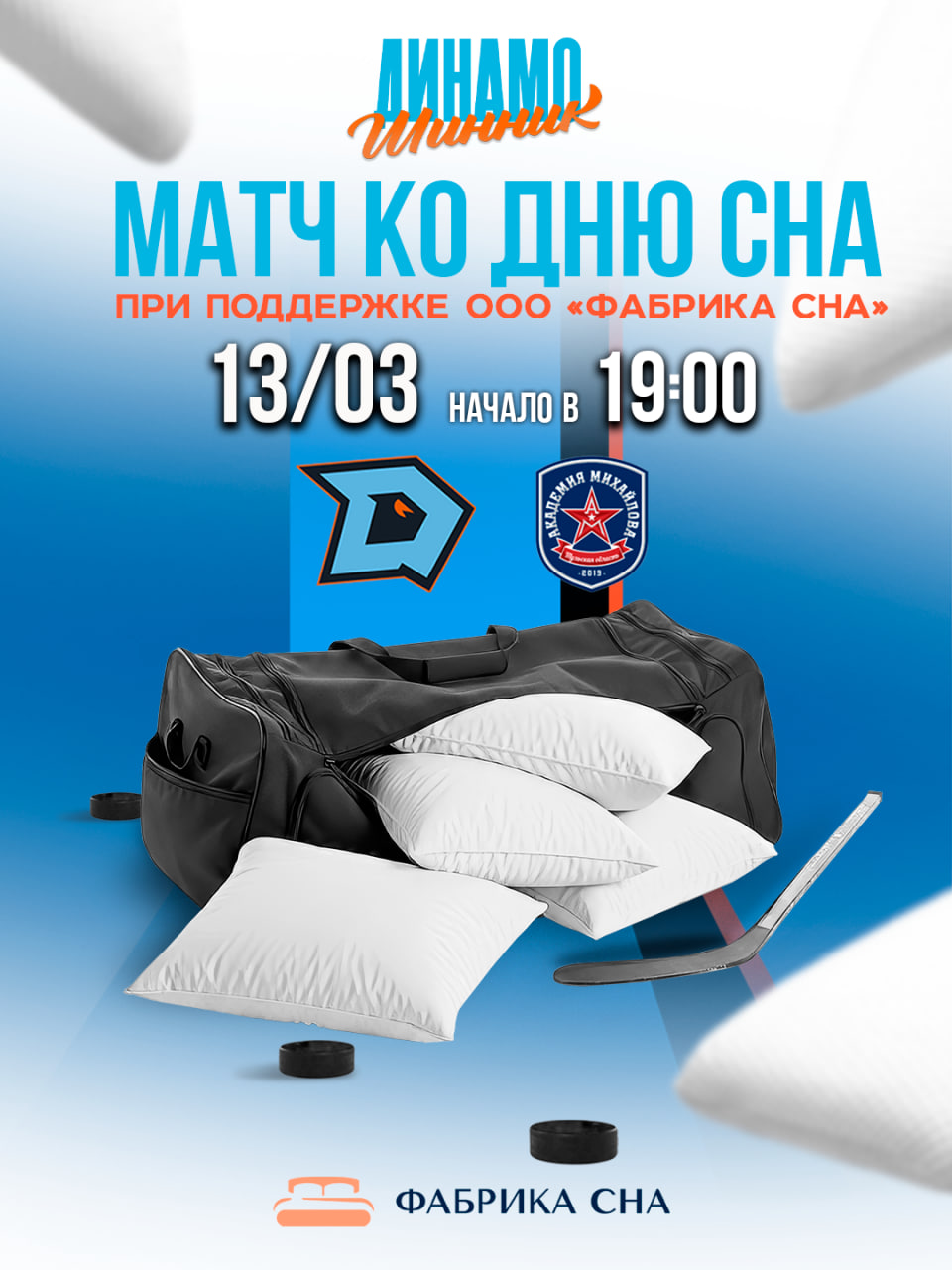 Для спортсменов сон является основным способом восстановления. Массаж, баня, криопроцедуры, тейпы, спортивное питание — все это бесполезно без полноценного сна. Компания «Фабрика сна» помогает людям чувствовать себя бодрыми и отдохнувшими весь день. Во всемирный день сна, который отмечается ежегодно в пятницу перед днем весеннего равноденствия, наши партнеры приготовили для вас множество подарков - подушки и анатомический матрас, розыгрыши и активности на арене! Поэтому скорее за билетами на сайт ticketpro.by.